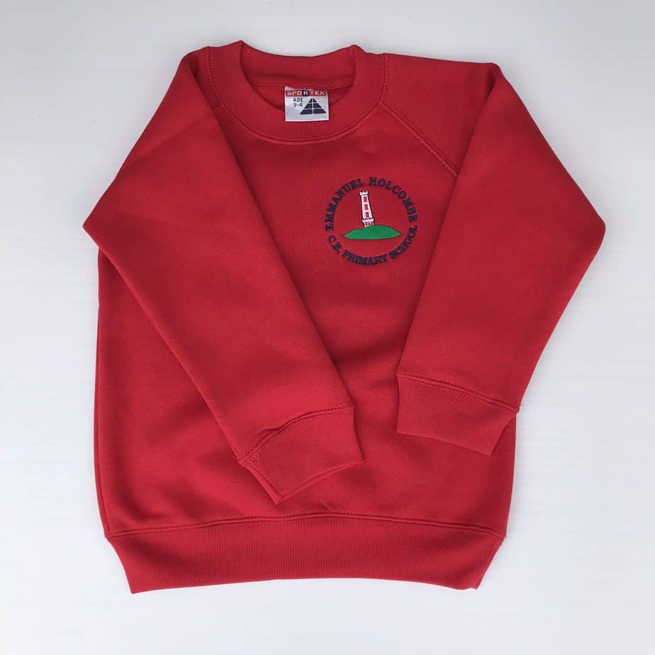Home / Shop by School / Emmanuel Holcombe Primary School / Emmanuel Holcombe Boys Uniform / Emmanuel Holcombe Sweat shirtEmmanuel Holcombe Sweat shirt£15.00Embroidered with School badge50% cotton/50% polyesterLycra ribbed cuffs, welt and neckTwin needle stitchingTaped neck40 degree washHeavy weight 310/320gsmSize Choose an option2-33-45-67-89-1011-1213SMALLMEDIUMClear - Emmanuel Holcombe Sweat shirt quantity + Add to basket SKU: N/A Category: Emmanuel Holcombe Boys Uniform Additional information Additional informationSize2-3, 3-4, 5-6, 7-8, 9-10, 11-12, 13, SMALL, MEDIUMRelated products Emmanuel Holcombe Polo shirt £11.00Emmanuel Holcombe Boys Uniform,Emmanuel Holcombe Girls UniformSelect options This product has multiple variants. The options may be chosen on the product page Junior Slim Fit Trousers-(Zip & clip) From £11.00Emmanuel Holcombe Boys Uniform,Greenmount Boys,Holcombe Brook Boys Uniform,Holcombe Brook Nursery Boys Uniform,Holly Mount Boys Uniform,Junior boy trousers,Peel Brow Boys Uniform,St Andrews Boys Uniform,St Joseph's Boys Uniform,Stubbins Boys Uniform,Summerseat Methodist Boys UniformSelect options This product has multiple variants. The options may be chosen on the product page Junior Regular Fit Trousers £9.50Emmanuel Holcombe Boys Uniform,Greenmount Boys,Holcombe Brook Boys Uniform,Holcombe Brook Nursery Boys Uniform,Holly Mount Boys Uniform,Junior boy trousers,Peel Brow Boys Uniform,St Andrews Boys Uniform,St Joseph's Boys Uniform,Stubbins Boys Uniform,Summerseat Methodist Boys UniformSelect options This product has multiple variants. The options may be chosen on the product page 3 Pack Ankle Socks-Grey From £3.99Emmanuel Holcombe Boys Uniform,Greenmount Boys,Guardian Angels Uniform,Holcombe Brook Boys Uniform,Holcombe Brook Nursery Boys Uniform,Holly Mount Boys Uniform,Our Lady of Lourdes Uniform,Peel Brow Boys Uniform,St Andrews Boys Uniform,St Joseph's Boys Uniform,Stubbins Boys Uniform,Summerseat Methodist Boys Uniform,SocksSelect options This product has multiple variants. The options may be chosen on the product page